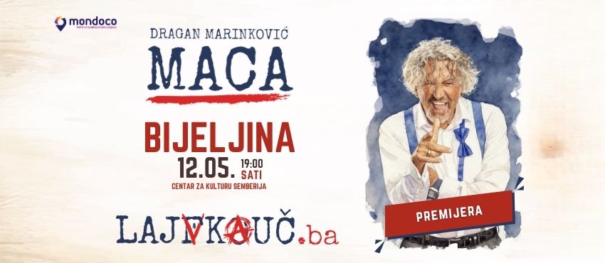 By clicking on the Buy a Ticket button you begin the process of purchasing tickets for DRAGAN MARINKOVIĆ MACA - LAJFKOUČ.BA - BIJELJINA 12/05 on 12.05.2026. 19:00 .
